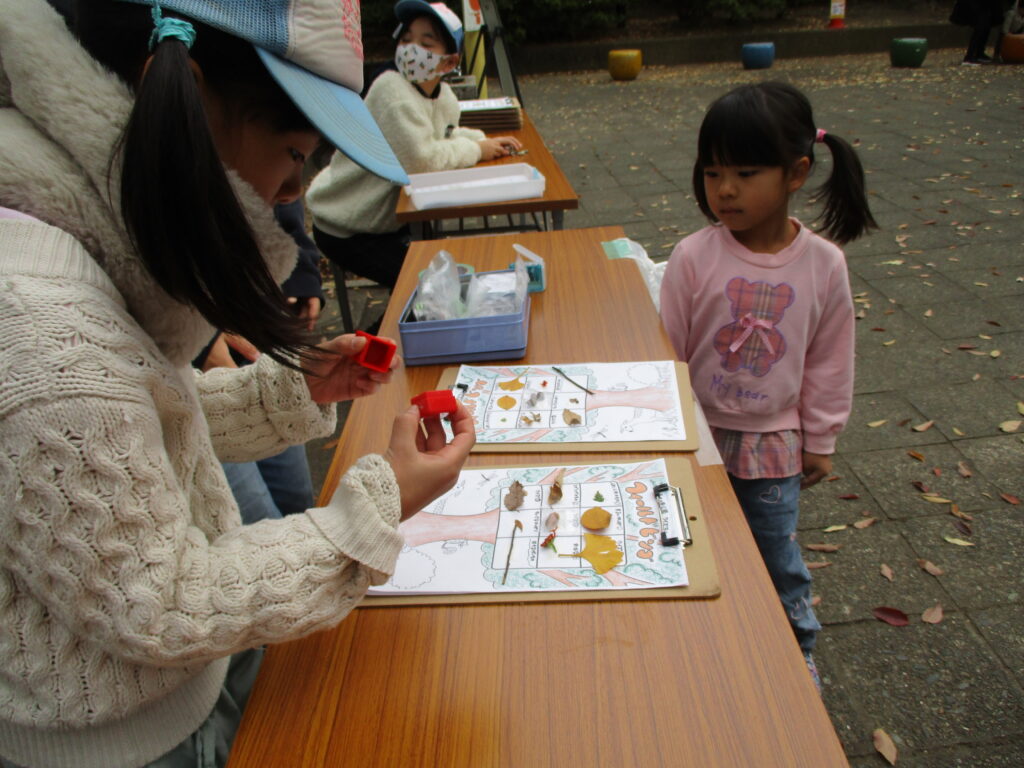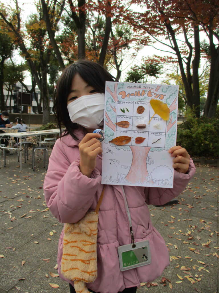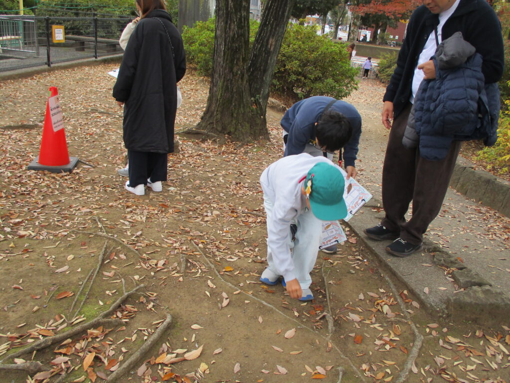 公園内に設置されたクイズや、ビンゴ用紙に貼れる自然物を探しに公園を散策します🍁