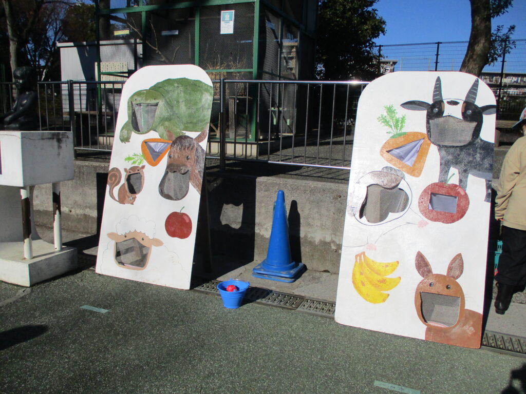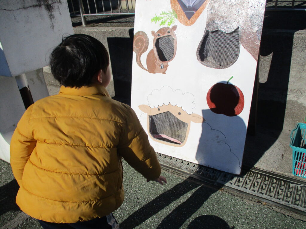 『エサをあげよう!』は板に描かれた動物の口にエサに見立てたボールを投げ入れる